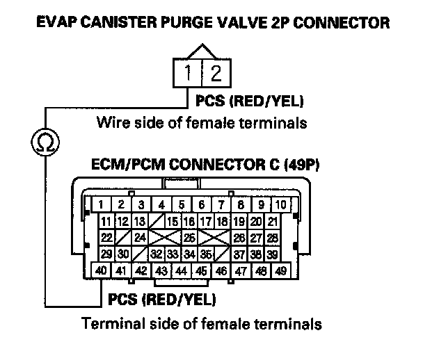 21. Check for continuity between ECM/PCM connector terminal C40 and EVAP canister purge valve 2P connector terminal No. 1.