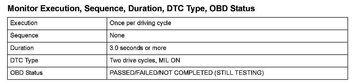 Monitor Execution, Sequence, Duration, DTC Type, OBD Status