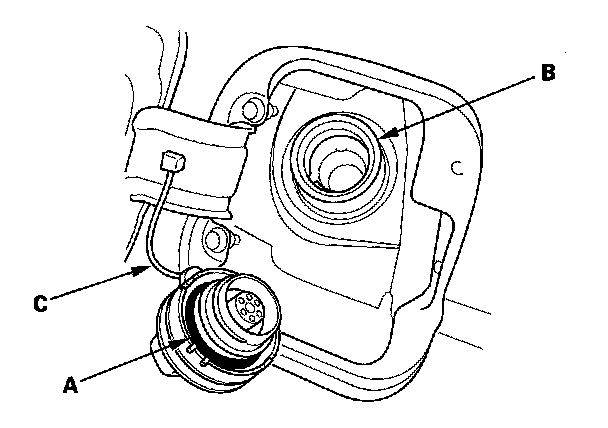 8. Disconnect the fuel tank vapor recirculation tube (A) from the EVAP canister (B), and plug the EVAP canister port (C).