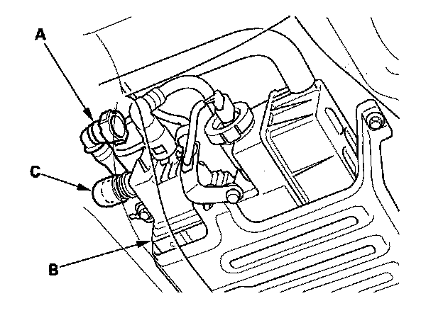 15. Disconnect the fresh air hose (A) from the EVAP canister vent shut valve (B), and plug the EVAP canister vent shut valve port (C).