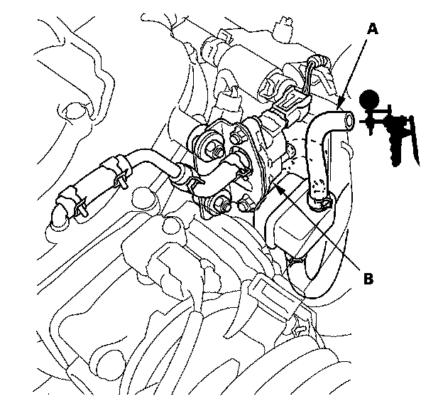 9. Disconnect the vacuum hose (purge line) (A) from the EVAP canister purge valve (B) in the engine compartment, and connect the vacuum pump/gauge, 0 - 30 in.Hg, to the vacuum hose as shown.