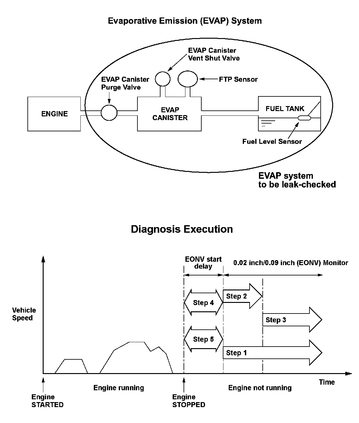The evaporative emission (EVAP) leak detection system uses an engine off natural vacuum (EONV) method. The EONV method detects leakage from the change in fuel tank pressure via the fuel tank pressure (FTP) sensor with the engine off.