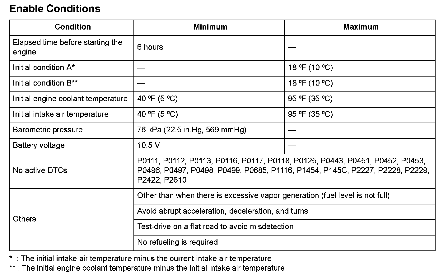 1. After the vehicle has been left for an appropriate amount of time as specified, with the engine coolant temperature and intake air temperature within the specified range, start the engine.