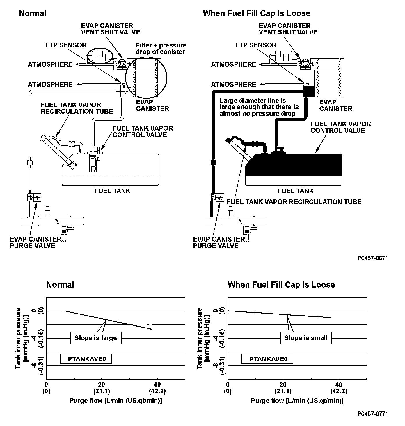 When the fuel fill cap is installed properly, the purge flow occurs due to the airflow resistance of the canister, and tank pressure will be reduced. When the fuel fill cap is loosened, the fuel tank pressure will not decrease even when the airflow resistance decreases and the purge flow occurs, because air is being exhausted from the tank to the atmosphere.