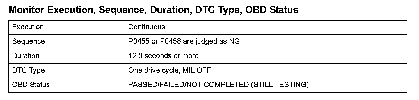 The output from the fuel cap monitor is 0.040 or less for at least 12.0 seconds (when there is no NG judgment history in this drive cycle).