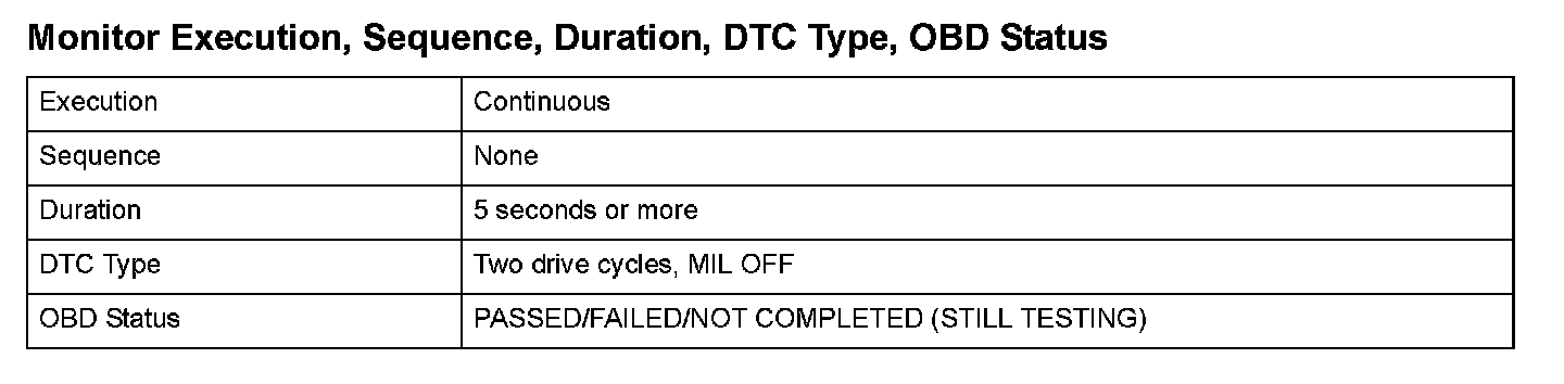 Monitor Execution, Sequence, Duration, DTC Type, OBD Status