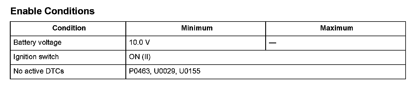 The fuel level sensor (fuel gauge sending unit) output voltage is 0.10 V or less for at least 5 seconds.