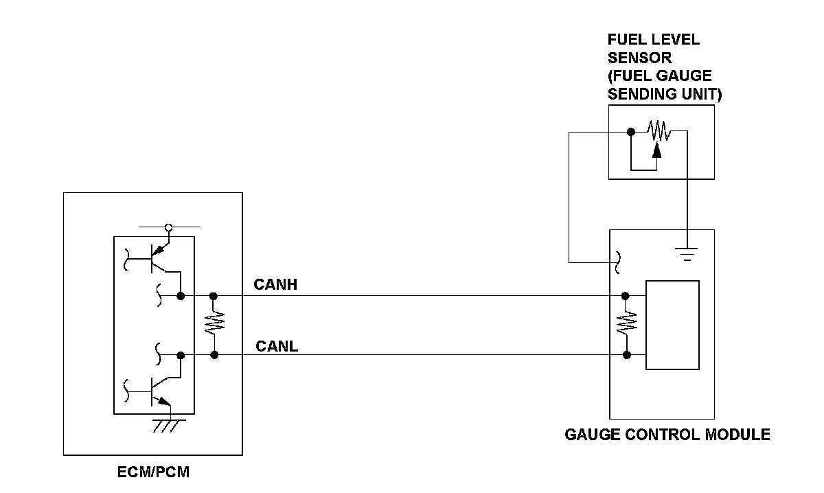 The fuel level sensor (fuel gauge sending unit) is incorporated into the fuel pump and installed in the fuel tank. Using a built-in potentiometer and float, it converts the movement of the float to electrical signals as an output that corresponds to fuel level variations in the fuel tank. The fuel level, which is indicated by the gauge control module, is sent to the engine control module (ECM)/powertrain control module (PCM) via the controller area network (CAN). If the ECM/PCM detects a signal from the fuel level sensor (fuel gauge sending unit) above a predetermined value for a set time or more, it detects a malfunction and stores a DTC.
