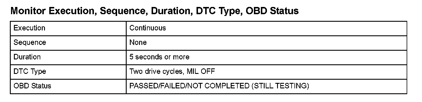 Monitor Execution, Sequence, Duration, DTC Type, OBD Status