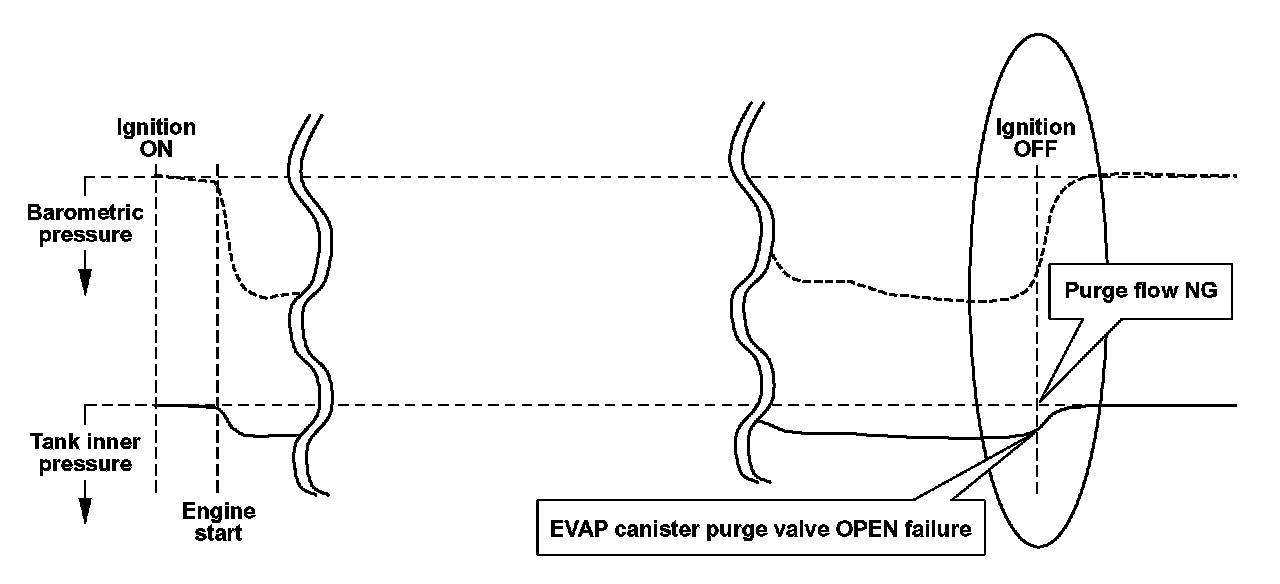 The EVAP canister purge valve opens normally (EVAP canister purge valve OPEN OK) and detects that the purge flow is normal when the pulse of the EVAP canister purge valve duty cycle is transmitted to the fuel tank pressure (FTP) sensor (pulse method).