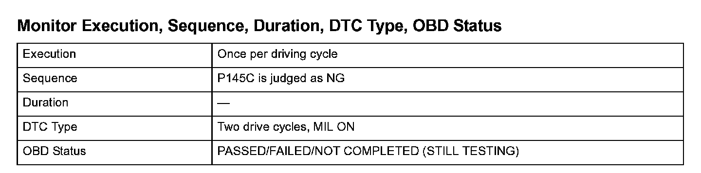 Monitor Execution, Sequence, Duration, DTC Type, OBD Status