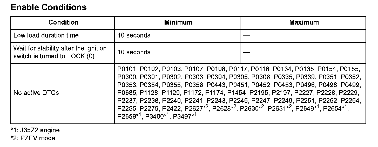 The output from the fuel tank pressure sensor is 0.3 kPa (0.08 in.Hg, 2 mmHg) or less for at least 10.0 seconds.