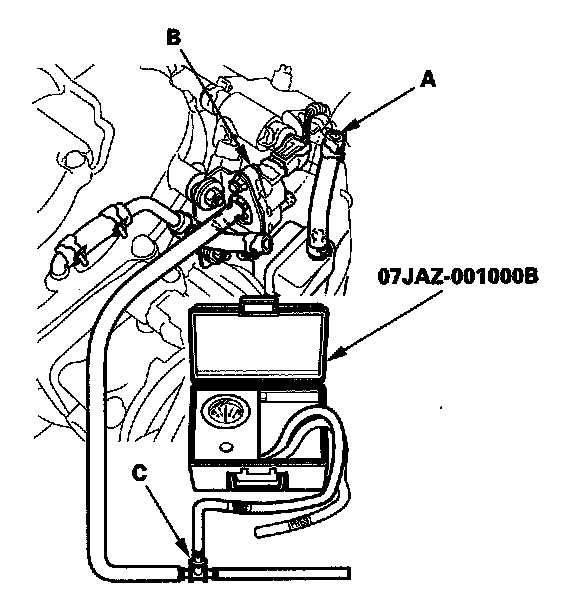 12. Disconnect the vacuum hose (A) from the EVAP canister purge valve (B). Connect the T-fitting (C) from the vacuum gauge and the vacuum pump/gauge, 0 - 30 in.Hg, and EVAP canister purge valve as shown.