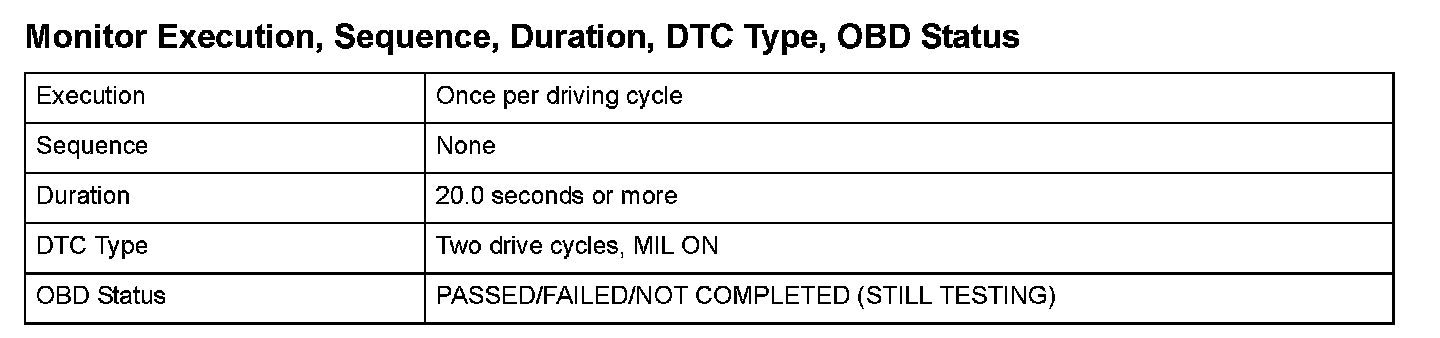 Monitor Execution, Sequence, Duration, DTC Type, OBD Status