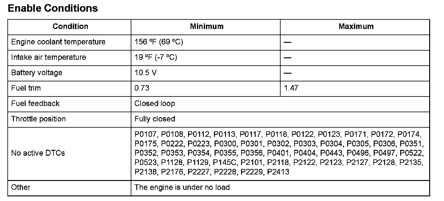 A target idle speed that meets the engine operating conditions (coolant temperature, A/C ON or OFF, etc.) is stored in the powertrain control module (PCM). The PCM monitors and controls the idle speed so that the actual idle speed is equal to the target idle speed. If the actual idle speed varies beyond a specified value from the target speed over a certain period of time, the PCM detects a malfunction in the idle speed control system and a DTC is stored.