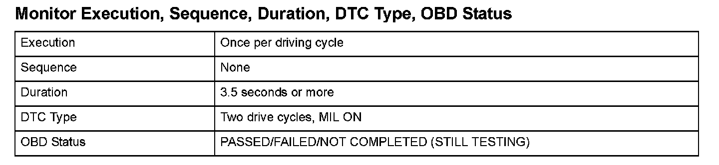 Monitor Execution, Sequence, Duration, DTC Type, OBD Status