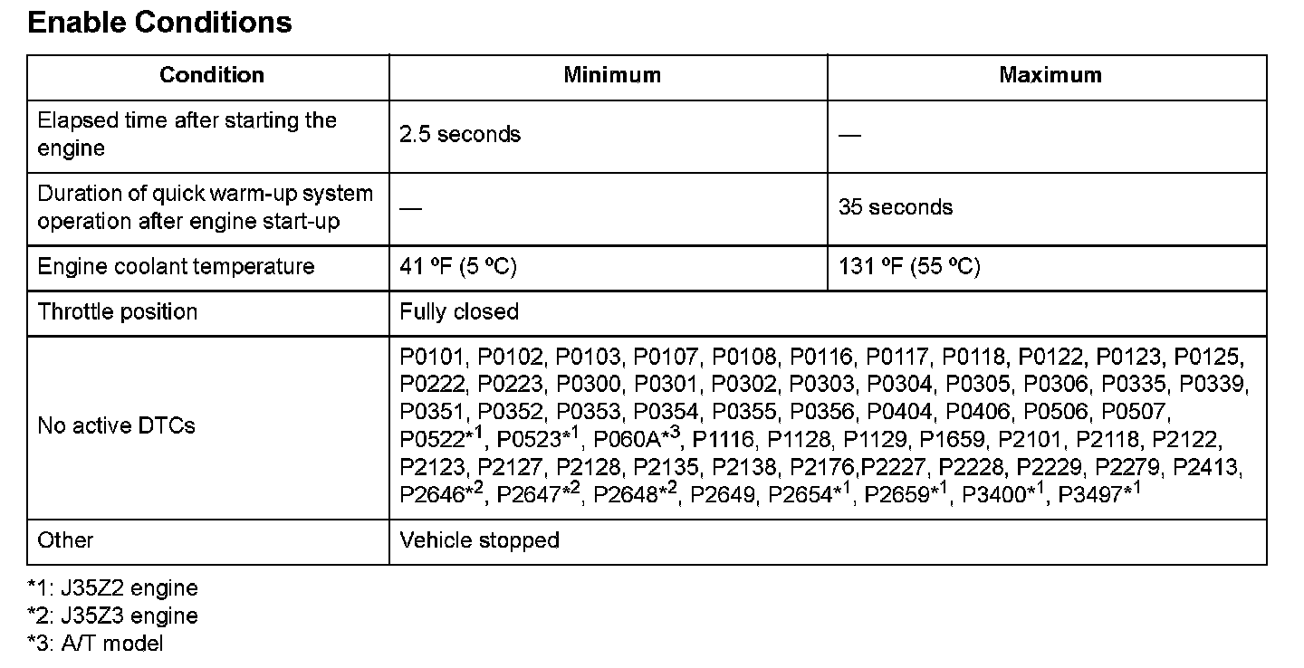 The quick warm-up system supplies additional air and retards the ignition timing when the engine is cold to activate the catalytic converter as quickly as possible. When the actual engine speed is a specified value or more, and it continues for a specified time, a malfunction is detected and a DTC is stored.
