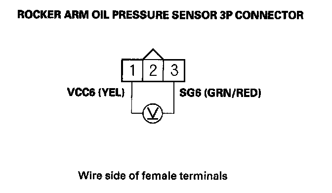 7. Measure the voltage between rocker arm oil pressure sensor 3P connector terminals No. 1 and No. 3.