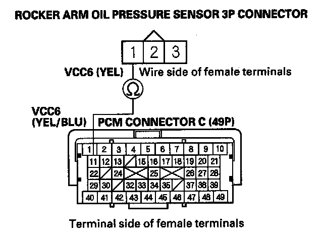 15. Check for continuity between PCM connector terminal C11 and rocker arm oil pressure sensor 3P connector terminal No. 1.