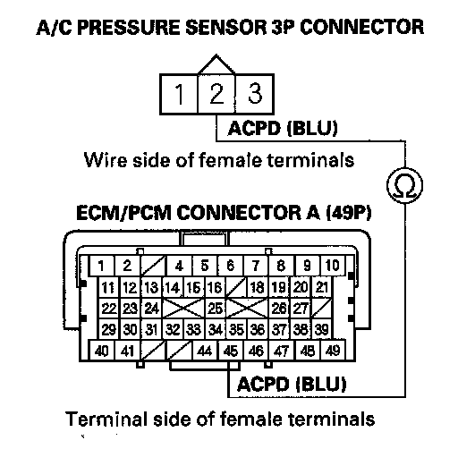 17. Check for continuity between A/C pressure sensor 3P connector terminal No. 2 and ECM/PCM connector terminal A45.