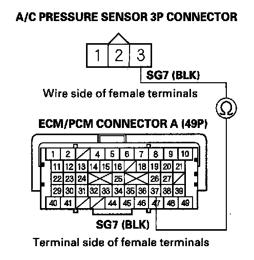 21. Check for continuity between A/C pressure sensor 3P connector terminal No. 3 and ECM/PCM connector terminal A37.