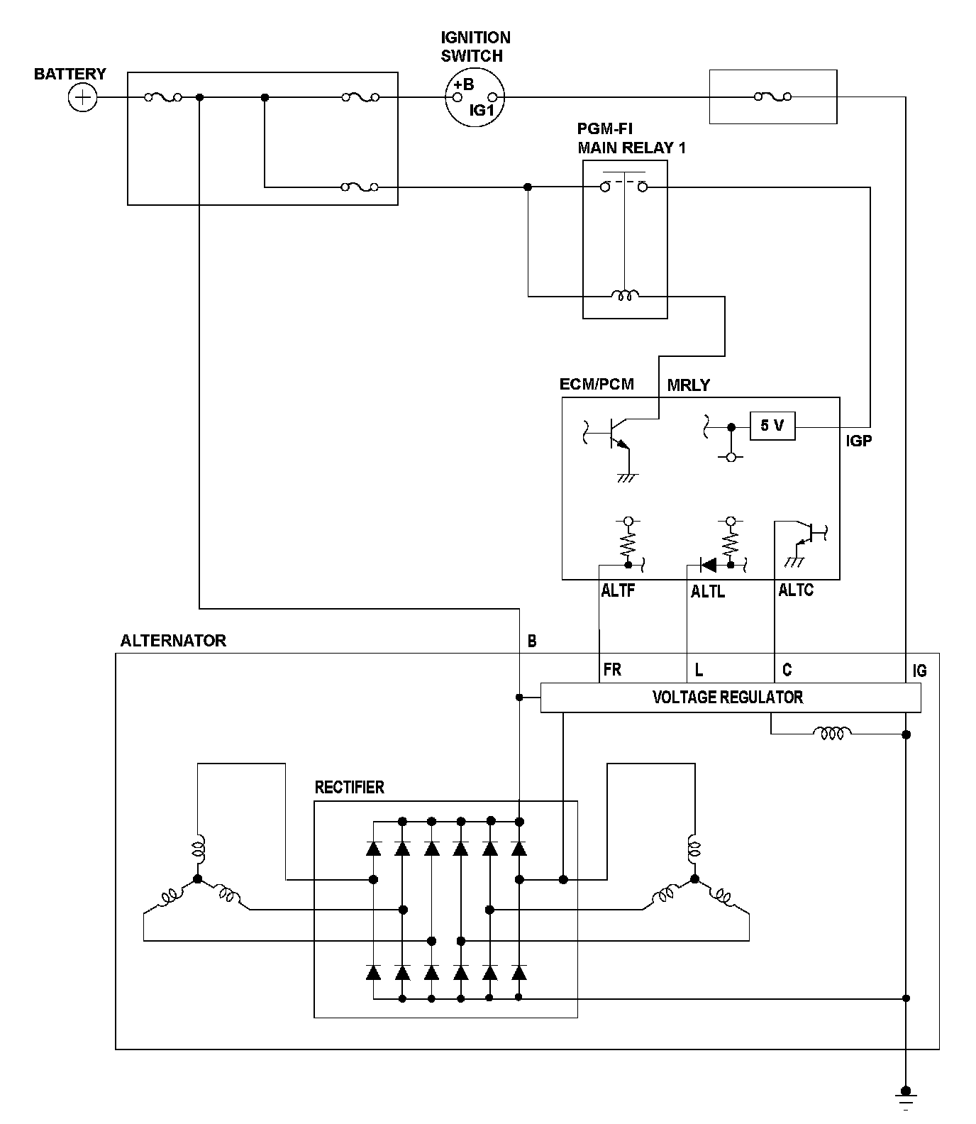 The alternator is driven by the engine, and it generates electricity to supply the necessary power to the electrical system and to charge the battery. The alternator voltage target values of 14.5 V and 12.5 V are achieved by switching the alternator control mode (controlled by the engine control module (ECM)/powertrain control module (PCM)). The alternator output signal is sent to the ECM/PCM, and it varies according to the battery's state of charge, the electrical load, and engine speed. When the IGP (power source) terminal voltage is a set value or less for a set time, the ECM/PCM detects a malfunction and a DTC is stored.