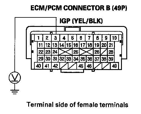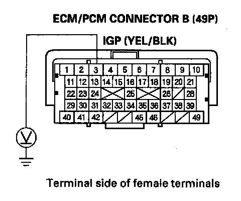 15. Measure voltage between ECM/PCM connector terminal B3 and body ground.