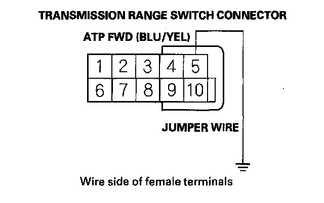 7. Connect the transmission range switch connector terminal No. 5 to body ground with a jumper wire. Turn the ignition switch to ON (II), and verify the ATP FWD input in the A/T data list.