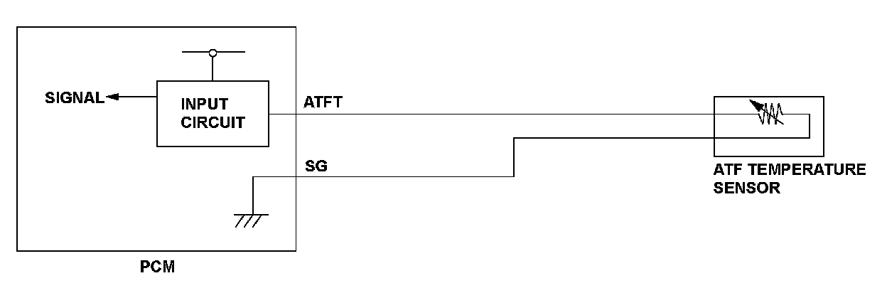 The ATF temperature sensor is a thermistor type sensor whose resistance changes according to the change in ATF temperature. The powertrain control module (PCM) sends a 5 V reference voltage to the sensor through a pull-up resistor. When the ATF temperature is low, the sensor resistance increases and the PCM detects a high signal voltage. As the ATF temperature rises, the sensor resistance decreases and the PCM detects a low signal voltage. When the ATF temperature sensor signal voltage to the PCM is under the specification, indicating that the temperature is above the specification (a short to ground), a malfunction is detected and a DTC is stored.