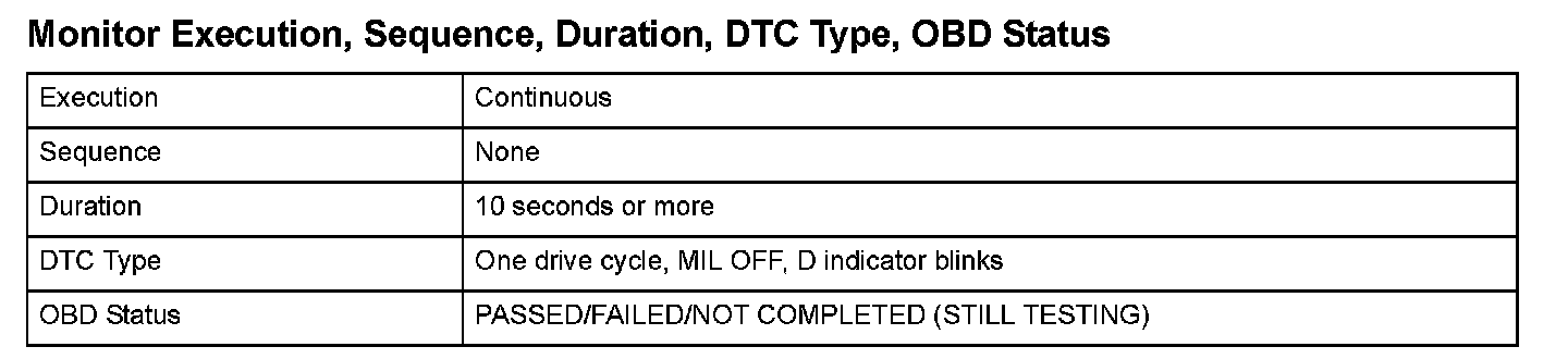 Monitor Execution, Sequence, Duration, DTC Type, OBD Status