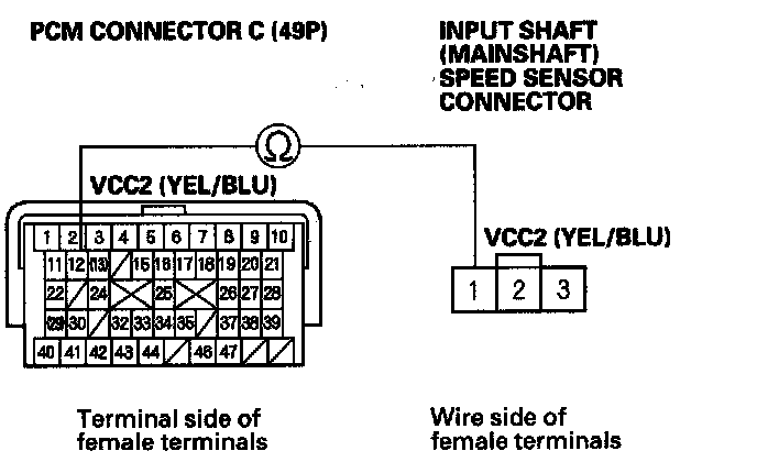 16. Check for continuity between PCM connector terminal C12 and input shaft (mainshaft) speed sensor connector terminal No. 1.