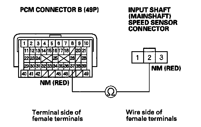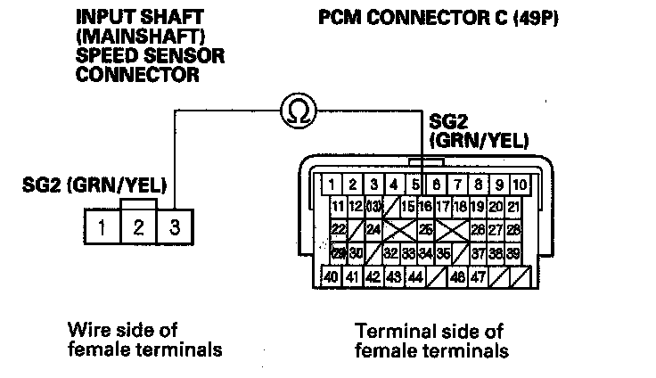 21. Check for continuity between PCM connector terminal C16 and input shaft (mainshaft) speed sensor connector terminal No. 3.
