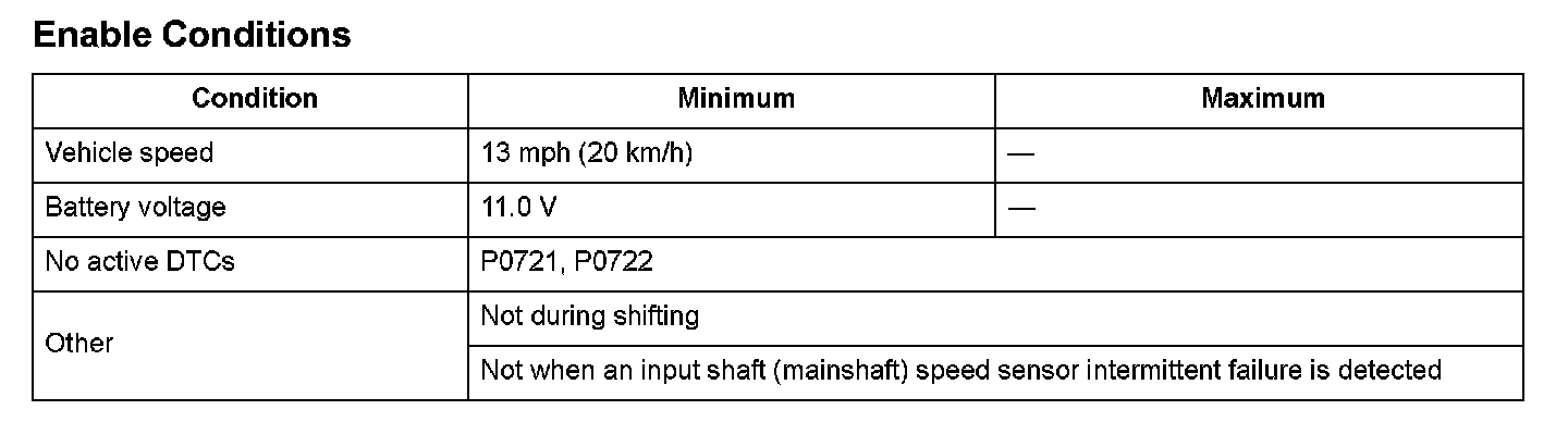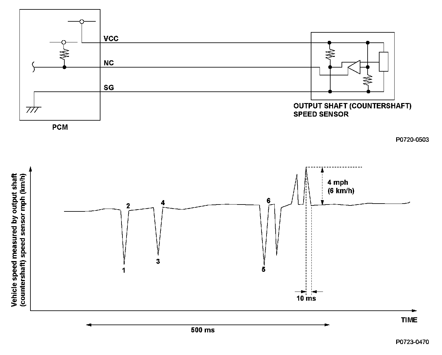The output shaft (countershaft) speed sensor is attached to the outside of the transmission housing. The output shaft (countershaft) speed sensor generates a pulsing signal according to the speed of the park gear on the output shaft (countershaft). Using that signal, the powertrain control module (PCM) determines the speed of the output shaft (countershaft). If pulse drop-outs occur with the output shaft (countershaft) rotating, the PCM detects a malfunction that may be caused by an open, a temporary open, or a short to ground. Based on the fluctuation of the vehicle speed measured by the output shaft (countershaft) speed sensor, a malfunction is detected and a DTC is stored.