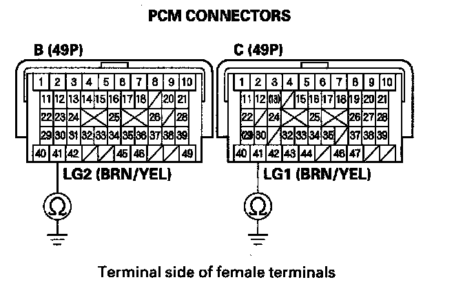 12. Check for continuity between PCM connector terminals B41 and body ground, and between C41 and body ground.