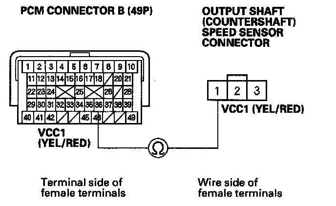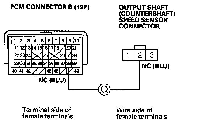 5. Disconnect the output shaft (countershaft) speed sensor connector, and inspect the connector and connector terminals to be sure they are making good contact.