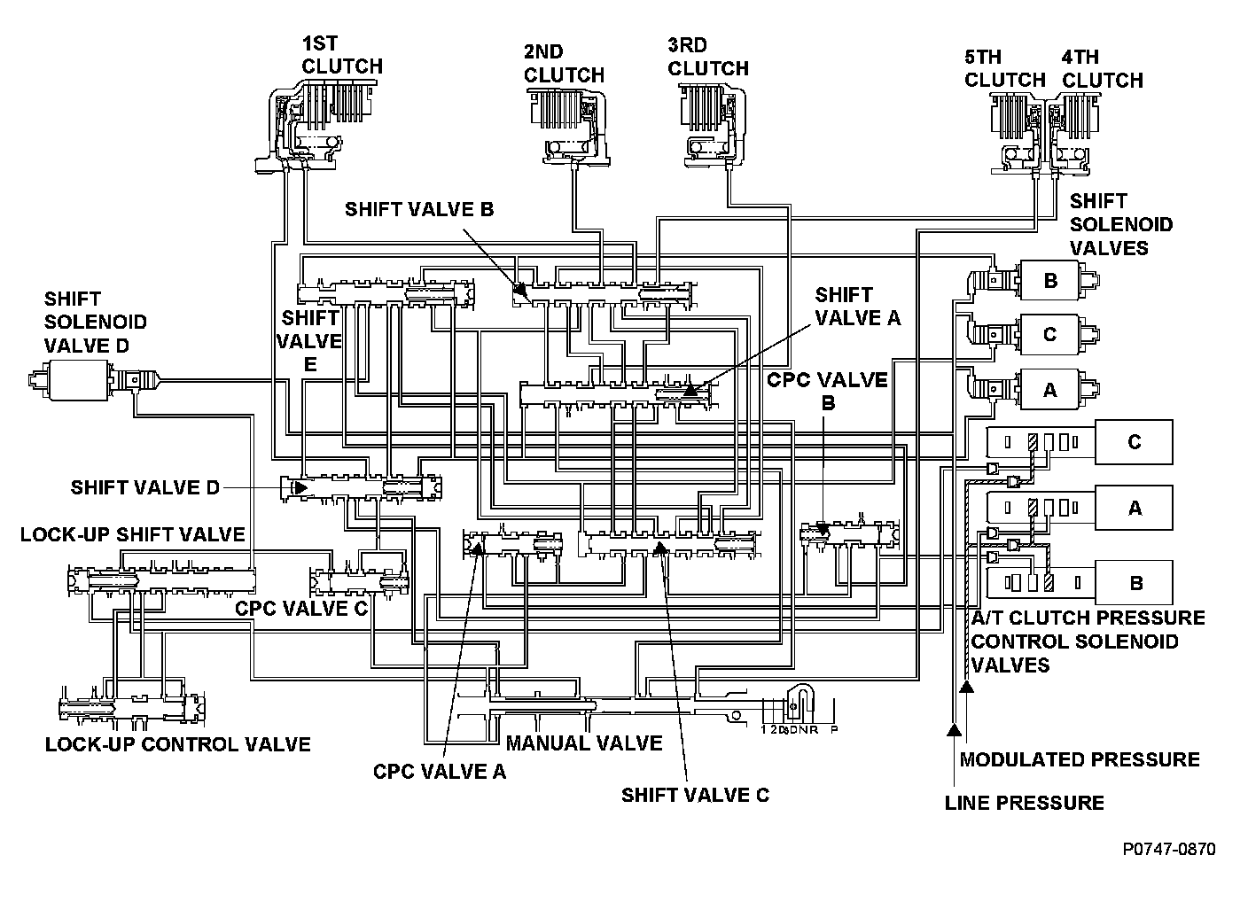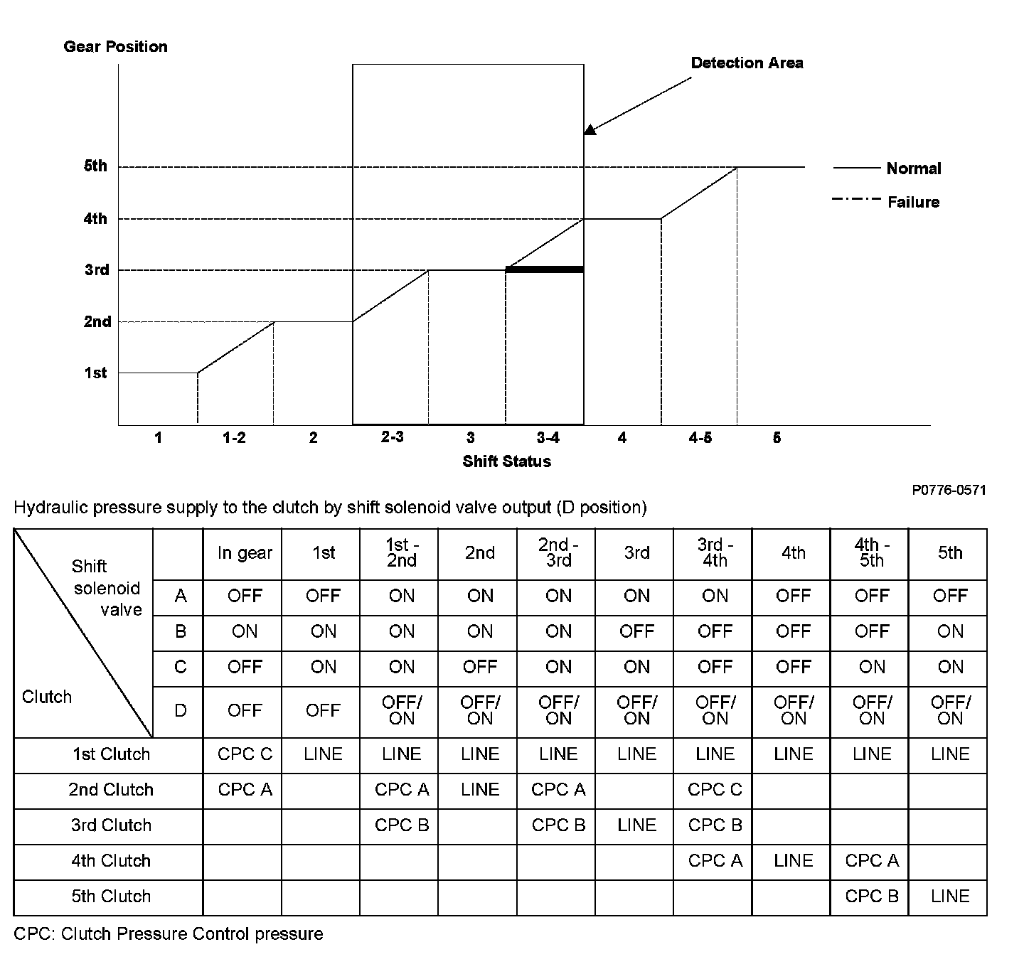 A/T clutch pressure control solenoid valve B is installed in the transmission housing. A/T clutch pressure control solenoid valve B is operated by the powertrain control module (PCM) and converts modulated pressure to A/T clutch pressure control solenoid B pressure, which operates CPC valve B. Line pressure is modulated to clutch pressure control B pressure (CPC B pressure) by CPC valve B and the CPC valve B spring. A signal from the PCM is output to the proper gear clutch, determined by the gear schedule, to supply the proper CPC pressure according to the driving conditions. When the current from the PCM is low (OFF), A/T clutch pressure control solenoid valve B operates and the CPC valve B pressure increases. When the current from the PCM is high (ON), A/T clutch pressure control solenoid valve B turns off and the CPC valve B pressure decreases. The PCM monitors the input shaft (mainshaft) speed and the output shaft (countershaft) speed at the gear change determined by the shift schedule. When an improper gear ratio is output compared to the predetermined gear change mode, an A/T clutch pressure control solenoid valve B OFF failure is detected and a DTC is stored.