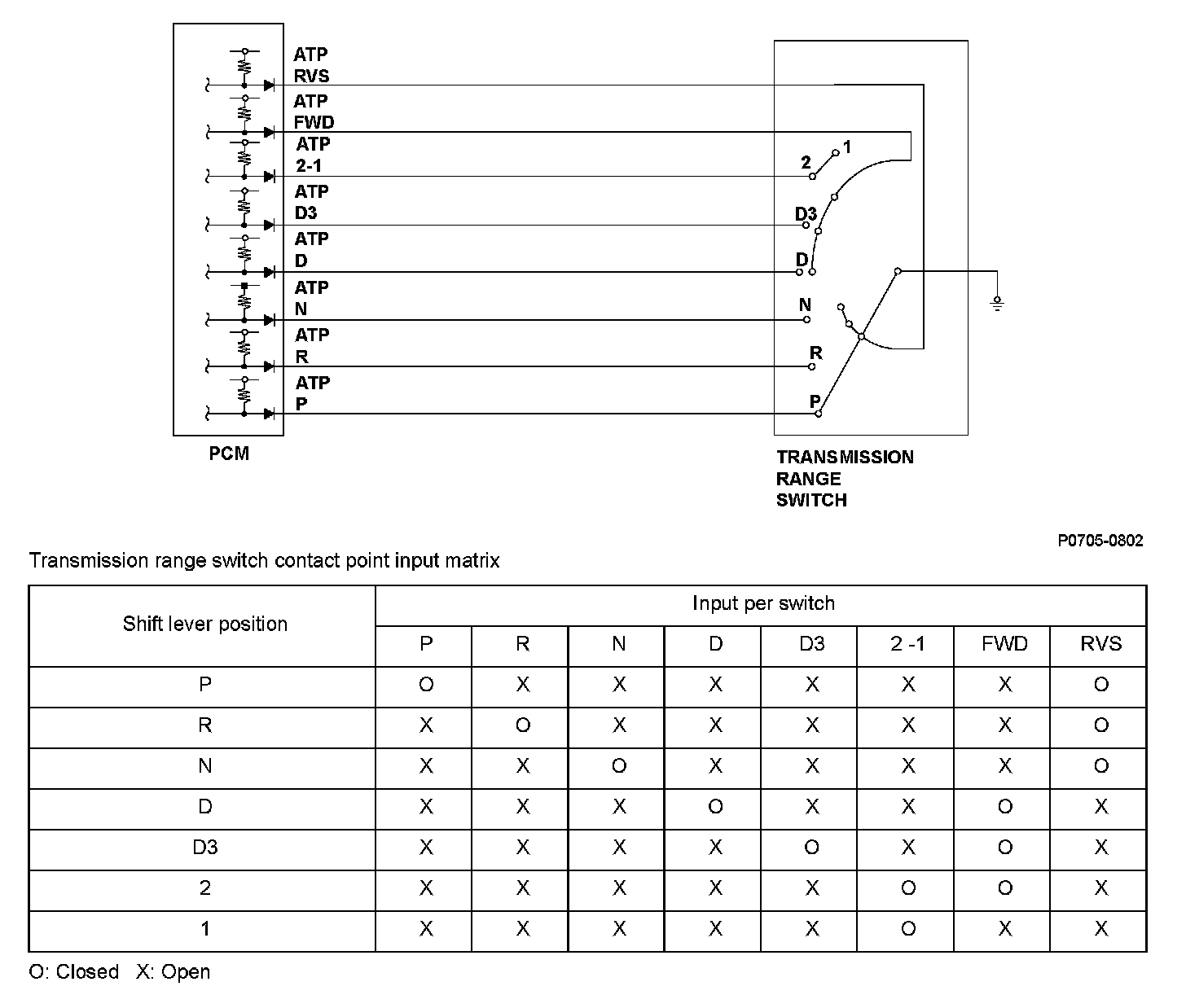 The transmission range switch is attached to the control shaft. Operating the shift lever makes the control shaft rotate via the shift cable. The A/T gear position indicator indicates which position is selected according to the Low/High signal combinations which vary based on the control shaft rotational angle. The control shaft changes the position of the transmission range switch, activates the manual valve, and switches hydraulic pressure to shift the transmission through forward/neutral/reverse. The transmission range switch signal is used to determine the shift schedule. The voltage is 5 V or 12 V (High) at the power-train control module (PCM) input terminal when each transmission range switch position is open, and it is 0 V (Low) when each switch is closed. If the R switch is OPEN with the shift lever in R, the PCM detects a switch OPEN failure and a DTC is stored.