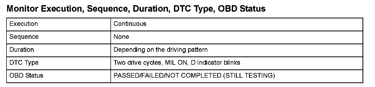 Monitor Execution, Sequence, Duration, DTC Type, OBD Status