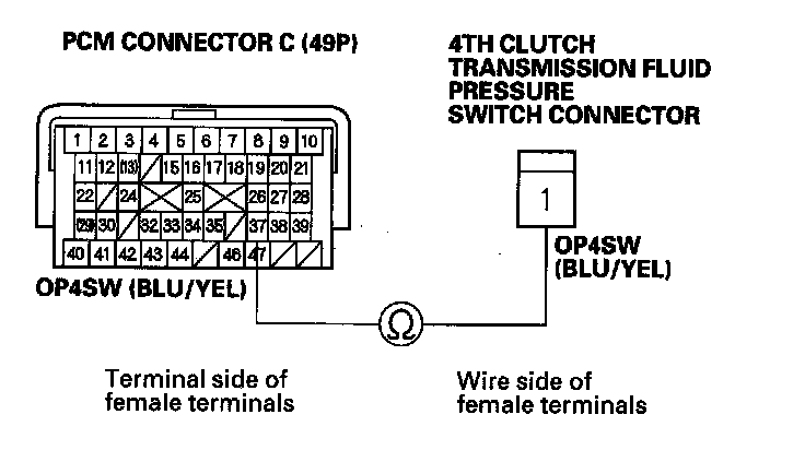 15. Check for continuity between PCM connector terminal C37 and the 4th clutch transmission fluid pressure switch connector terminal.