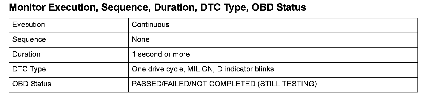 Monitor Execution, Sequence, Duration, DTC Type, OBD Status