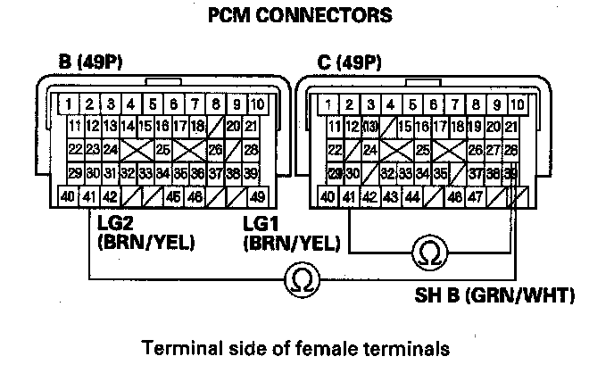 10. Measure the resistance between PCM connector terminals C28 and B41 or C41.