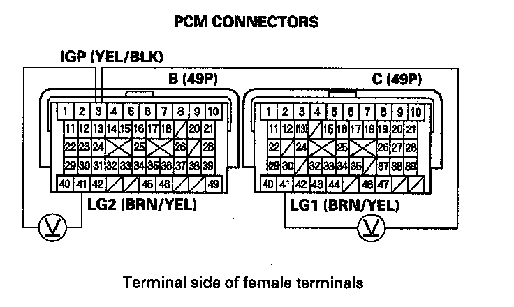 15. Measure the voltage between PCM connector terminals B3 and B41 or C41.