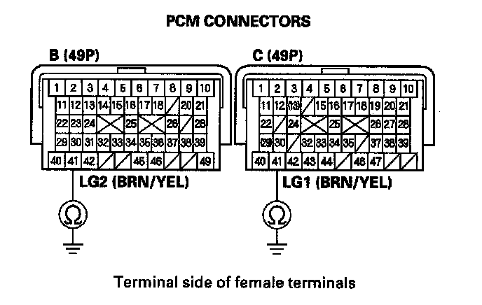 17. Check for continuity between PCM connector terminals B41 and body ground, and between C41 and body ground.