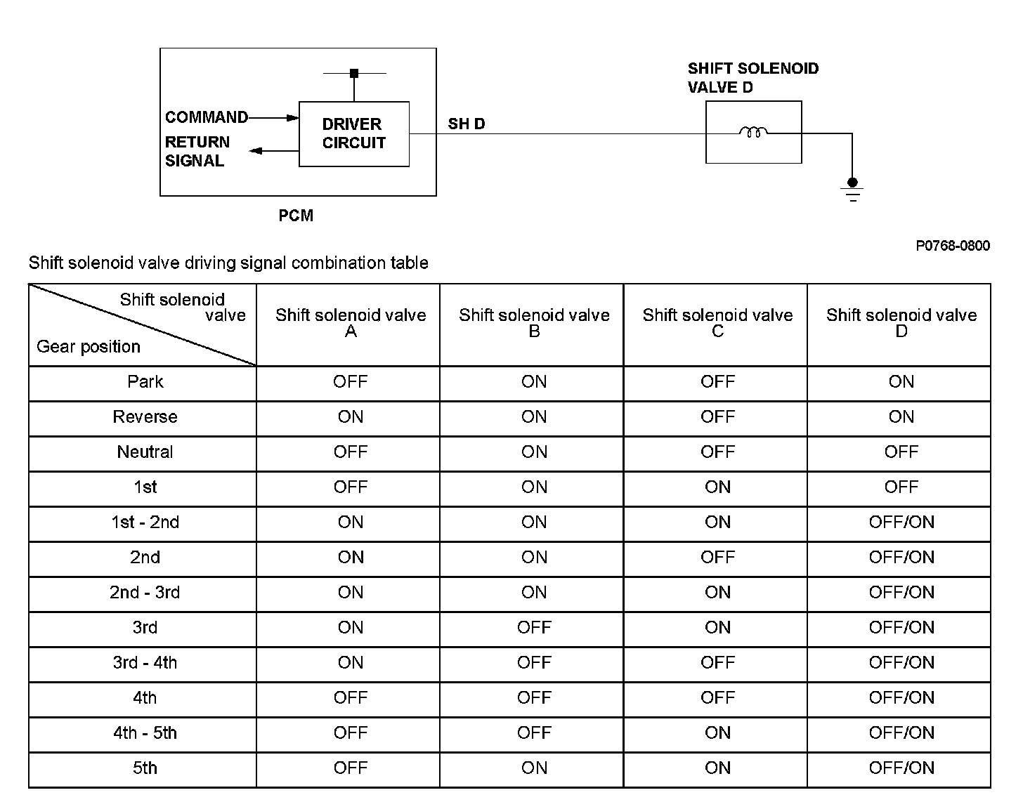 When shift solenoid valves A and D are turned ON, the hydraulic pressure circuit opens. When shift solenoid valves B and C are turned OFF, the hydraulic pressure circuit opens. The hydraulic pressure circuit supplies/discharges hydraulic pressure to/from each clutch according to the combination of the ON/OFF status of those valves and the shift valves. The powertrain control module (PCM) commands the driver circuit to turn on the shift solenoid valve. The circuit diagnoses malfunctions such as a circuit short or open, and sends back a return signal during the PCM's command. A malfunction is detected when the return signal does not match the PCM command to turn ON the shift solenoid valve, and a DTC is stored.