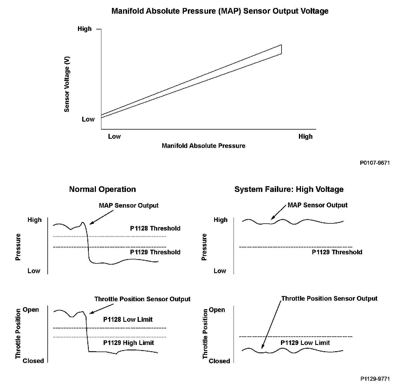 The manifold absolute pressure (MAP) sensor senses manifold absolute pressure (vacuum) and converts it into electrical signals. The MAP sensor outputs low signal voltage at high-vacuum (throttle valve closed) and high signal voltage at low-vacuum (throttle valve wide open). The powertrain control module (PCM) compares a predetermined MAP value at a given throttle position and manifold absolute pressure to the output voltage value of the MAP sensor. If the MAP sensor outputs high voltage during fuel cut-off operation for deceleration with the throttle valve fully closed, which should make the manifold absolute pressure lower, the PCM detects a malfunction and stores a DTC.