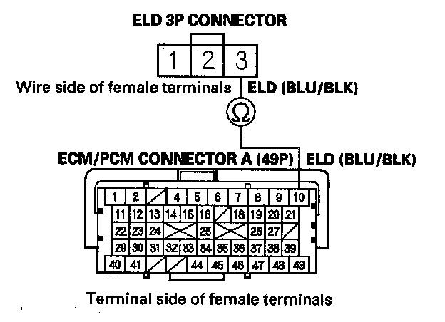 10. Check for continuity between ECM/PCM connector terminal A10 and ELD 3P connector terminal No. 3.