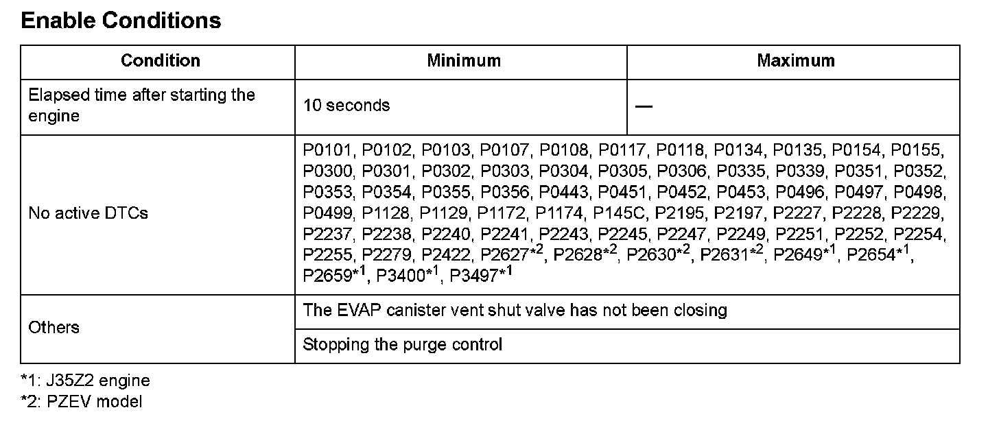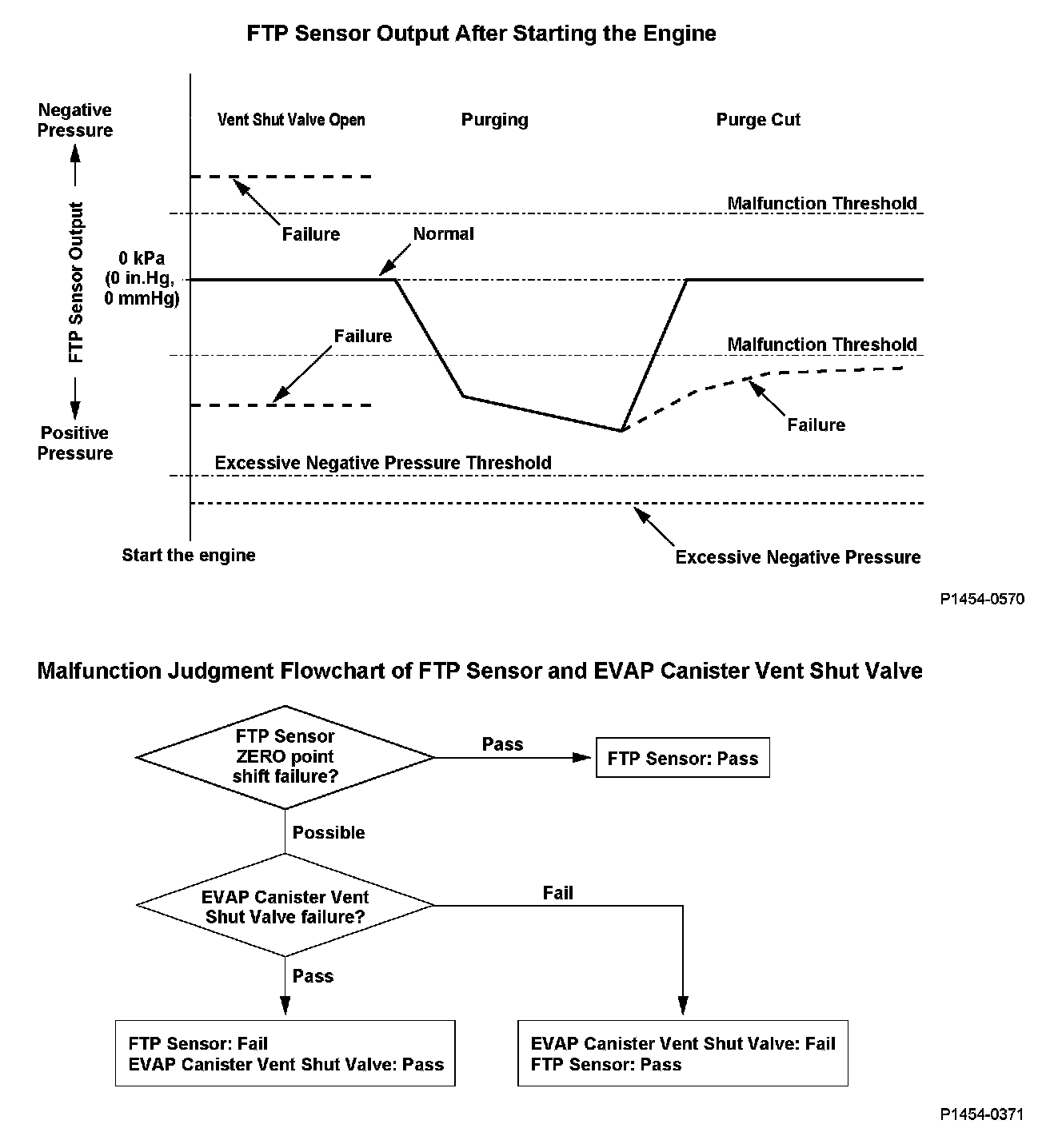 The fuel tank pressure is about 0 kPa (0 in.Hg, 0 mmHg) when starting a cold engine. When the fuel tank pressure (FTP) sensor output value is out of a specified range and the engine control module (ECM)/powertrain control module (PCM) judges that there's no other cause [no evaporative emission (EVAP) canister vent shut valve failure, etc.] of the FTP sensor zero point shift, the ECM/PCM detects an FTP sensor malfunction. However, if the FTP sensor output when starting the engine is a prescribed negative value or less (excessive negative pressure is detected), the malfunction judgment should be done as follows because it is difficult to distinguish the FTP sensor zero point shift (P1454) from the EVAP canister vent shut valve failure (P2422).