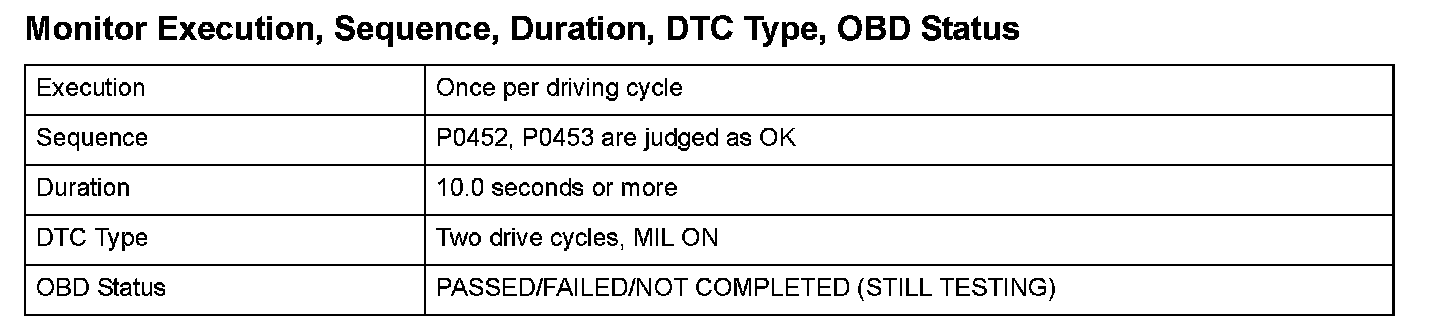 Monitor Execution, Sequence, Duration, DTC Type, OBD Status