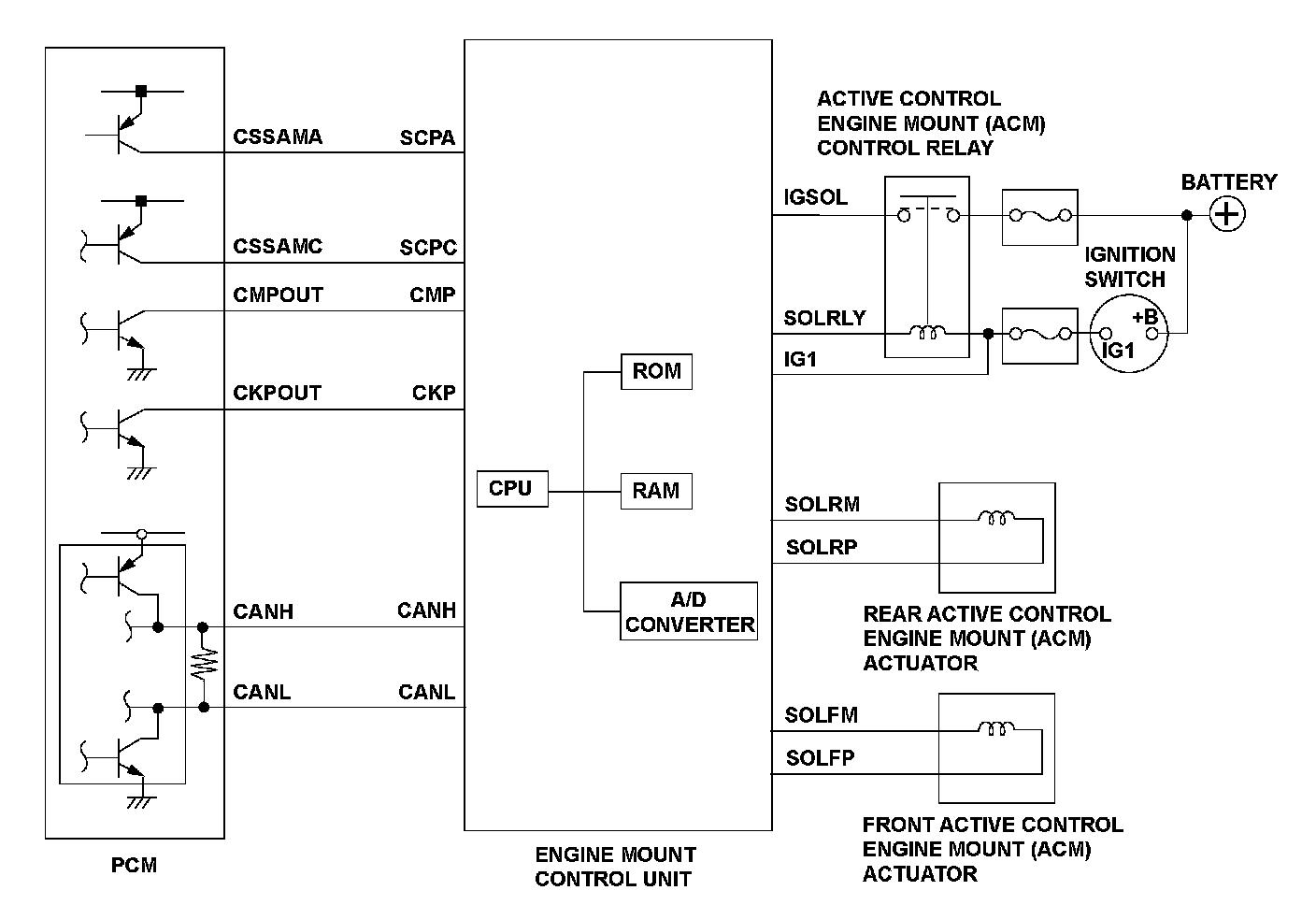 The engine mount control system controls the engine mounts electronically. The system consists of the active control engine mount (ACM) actuators, the engine mount control unit, and the powertrain control module (PCM). The engine mount control unit uses the crankshaft and camshaft position sensor outputs (received from the PCM) to estimate engine vibration. The engine mount control unit then sends signals to the ACM actuators to command the engine mounts to push and pull on the engine to counteract the engine vibration. The PCM monitors the IG1 terminal voltage. If the IGP1 terminal voltage is set value or less for a set time, the PCM detects a malfunction and a DTC is stored.