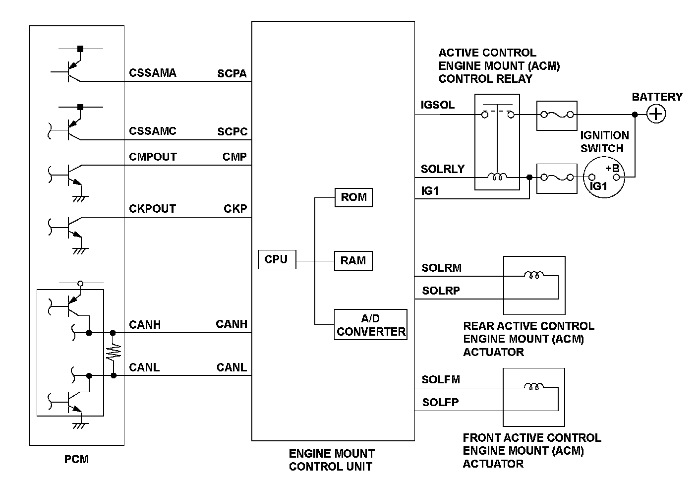 The engine mount control system controls the engine mounts electronically. The system consists of the active control engine mount (ACM) actuators, the engine mount control unit, and the powertrain control module (PCM). The engine mount control unit uses the crankshaft and camshaft position sensor outputs (received from the PCM) to estimate engine vibration. The engine mount control unit then sends signals to the ACM actuators to command the engine mounts to push and pull on the engine to counteract the engine vibration. The PCM monitors the SCPA signal. If the SCPA signal input value differs from the PCM output value (received by CAN communication) for a set time, the PCM detects a malfunction and a DTC is stored.